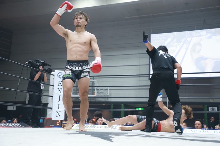 2Rも夜叉猿が前に出て行って左右フック、戦熊はワンツーを返して左ミドル。戦熊がワンツーを打ったとこで夜叉猿が右ストレートのカウンターでダウンをお奪う。左フックからの右ストレートで襲い掛かる夜叉猿が右ストレートからの左フックでダウンを追加。一気に左右フックでラッシュをかける夜叉猿。戦熊もロープを背負いながら打ち返す。ここで夜叉猿は冷静に左アッパー2発で戦熊のアゴを上げさせると右フックを打ち込んで最後のダウンを奪取。