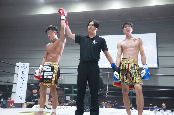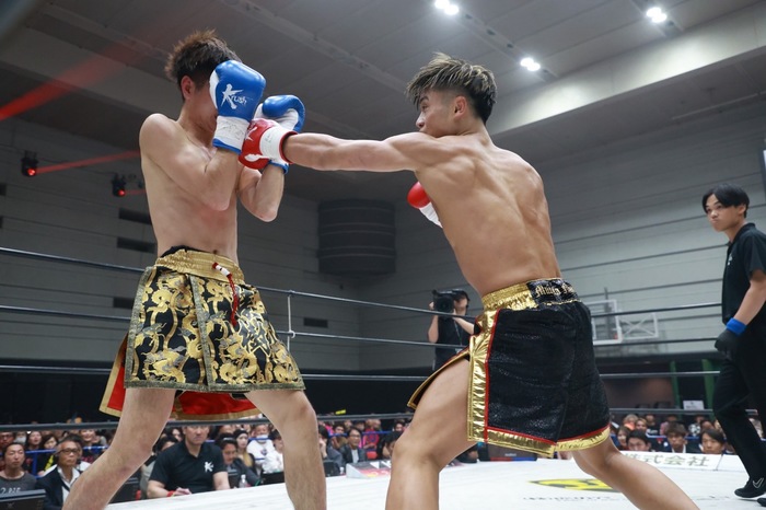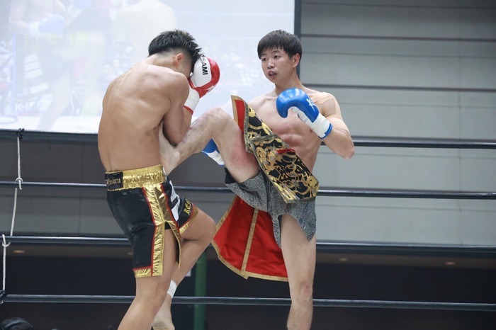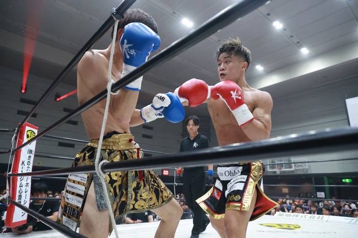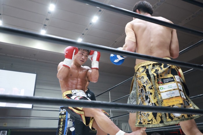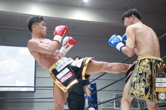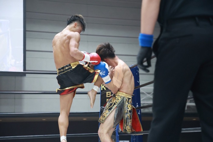 1R、ガードを固めて前へ出る村田が左カーフ、サウスポーの木塚はジャブと前蹴り。村田の右ハイがヒットする木塚は左ミドルからの左ストレート、前へ出る村田にヒザを突き上げて前へ出るが、すぐに村田が圧をかけて前へ出る。村田の左ボディ、右フック。木塚は村田の左フックをブロックして左フックを打ち返すが、村田のインローにバランスを崩す。