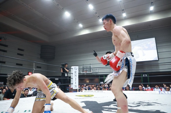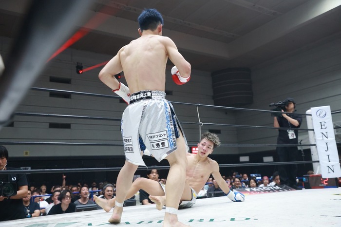 3R、安尾はジャブを突きながら回り込んでの右ミドル。吉川は右ストレートからの左フックを狙うが、安尾が飛びヒザからパンチをまとめ、後ろ蹴りも命中させる。吉川が左フックを振り被ったところに安尾が左フックを合わせ、ダウンを奪う。左右フックと飛びヒザでラッシュをかける安尾だが、吉川は前へ出てワンツーで打ち返すガッツを見せた。