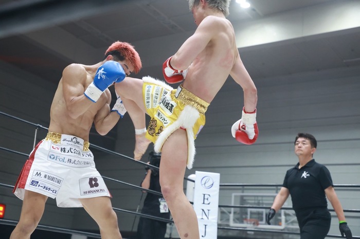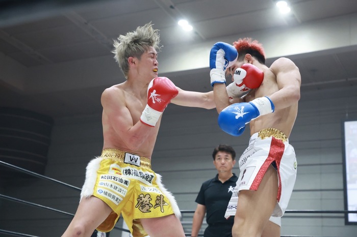 1R、竹添は一度身体を沈めての左ショートアッパーを多用。これに苦しむ啓斗だったが、右フックをヒットさせて逆襲。左右フック、左右ボディで攻め、啓斗がアッパーを出してくるとヒザを突き上げる。竹添はここで左ミドルを蹴って流れを変えようとする。