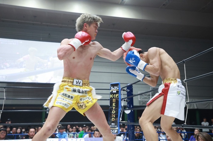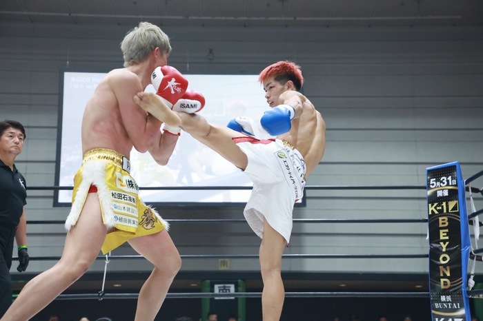 2R、竹添は左ミドルを多用してそこからパンチにつなげていく。啓斗は入り込もうとするが、竹添は強い左ミドルを連打してそれを阻止。それでも竹添は前へ出て左ボディを打つ。竹添はノーガードになると竹添のパンチをかわしていき、潜り込んでの右アッパー。啓斗は左ボディを返す。