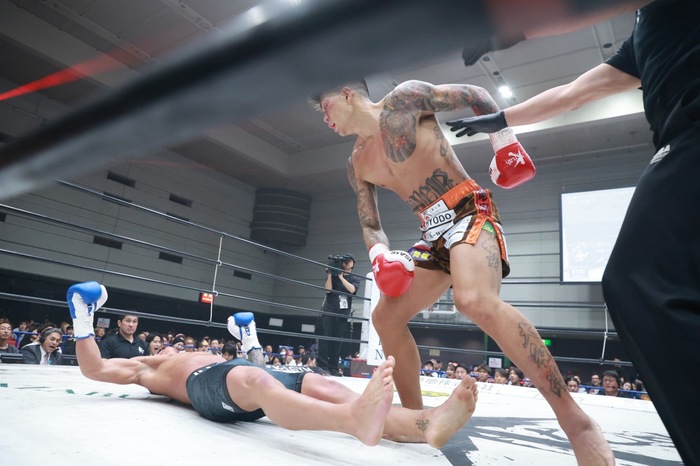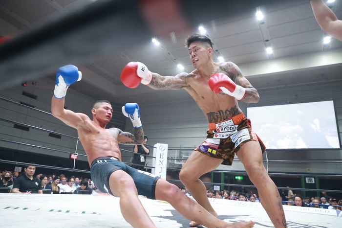 1R、ワンツーを繰り出して杉若が前に出る。サウスポーの海斗は杉若の右ミドルに左ストレートを合わせに行き、左カーフ、左ミドルを蹴る。しかし、杉若の前進は止まらない。海斗は左右フック連打で勝負を仕掛け、これでダウンを奪う。さらにラッシュをかけて嵐のような左右フックでダウンを追加する海斗。