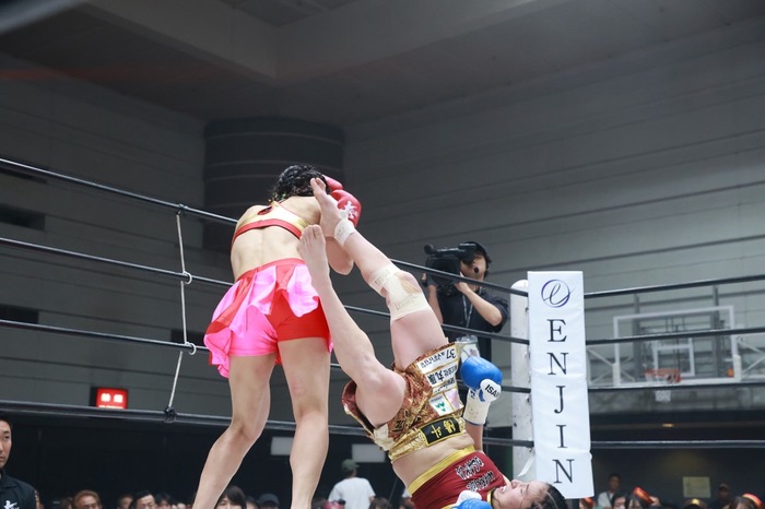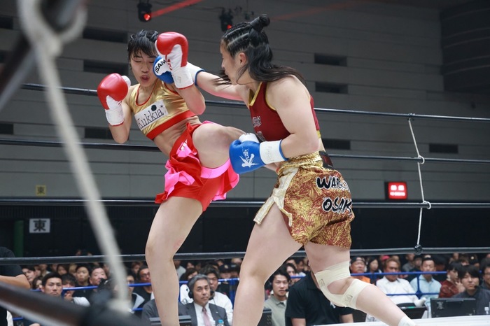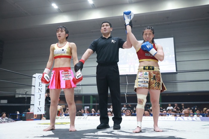 1R、麻央はジャブ、美伶は飛び込んでの左フックを繰り出す。右カーフを蹴って飛び込む美伶。麻央はジャブを多用し、距離をとる。美伶は距離を詰めて打ち合いに持ち込もうとするが、麻央は前蹴りで距離を作る。