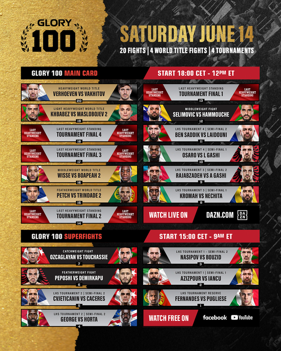 公式声明によると「私たちはファンの声に耳を傾け、全てを1つの大きなイベントにまとめることにしました。GLORY100を2夜にわたって開催することは、正直言って高価な提案でした。新しいフォーマットでは、生中継で自宅からの視聴でも、誰もが一晩でGLORY100の全容を体験することができます。これは、このスポーツの歴史における節目を記念する方法であり、全てのファンが1つの素晴らしいイベントで全ての素晴らしい試合とファイターを楽しむことができることを保証するものです。結局のところ、これは私たちの偉大なスポーツ、ファイター、そしてファンの祭典なのです」と、ファンの負担を減らすために1日にまとめたという。