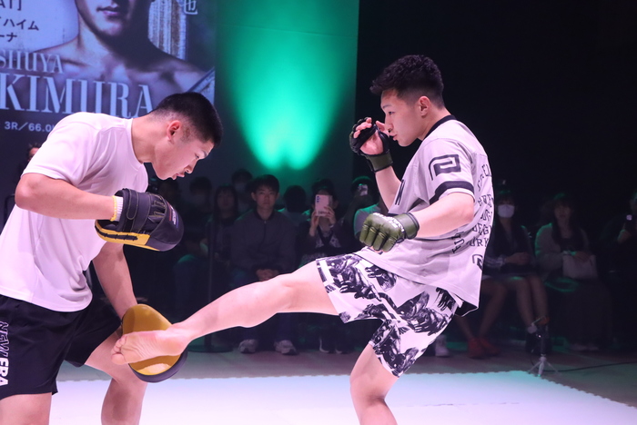 RIZINフェザー級(66.0kg)5分3Rでヴガール・ケラモフ(アゼルバイジャン)と対戦する木村柊也(BRAVE)は、1分半のミット打ちでジャブ、右ストレート、ジャブからの右アッパー、右ミドルと打撃を披露。