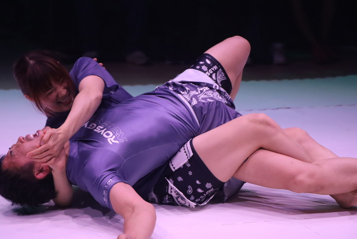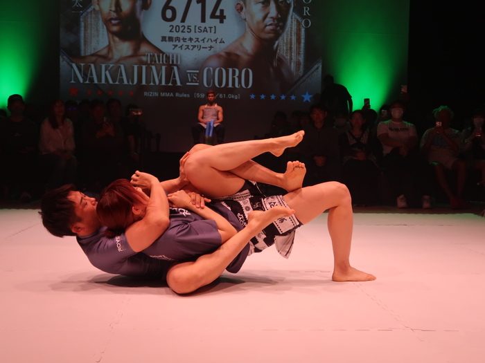 最初にCOROが、妻のRIZIN女子スーパーアトム級王者・伊澤星花(JAPAN TOP TEAM)とグラップリングスパー。いきなりテイクダウンしたCOROだったが伊澤が下になっても動き回り、両者が体勢を目まぐるしく入れ替える、いわゆる回転体の動き。しかし、最後は伊澤がツイスターで主役であるはずのCOROからタップを奪って終了。