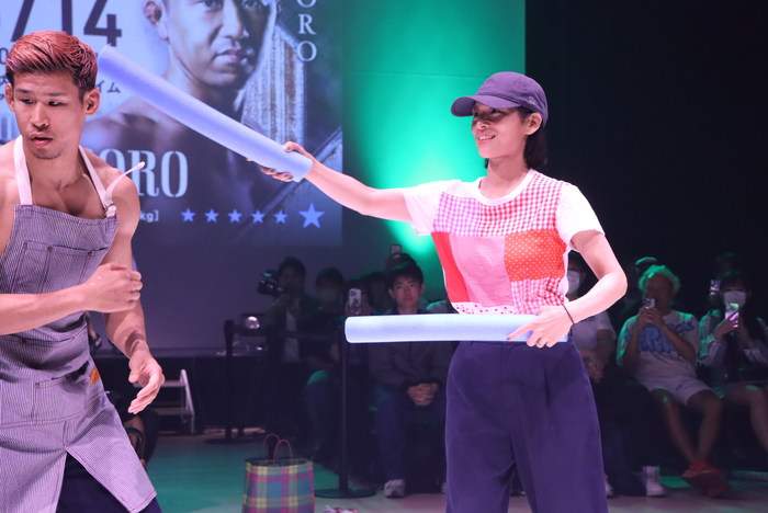 これに対抗したか、裸エプロンで登場した中島は客席にいた妻を呼び出す。その妻にスティックを持たせて殴らせ、中島がボディワークでかわすという公開練習となったが、意外にも妻のスティックさばきが速く、ちょいちょい被弾する中島。