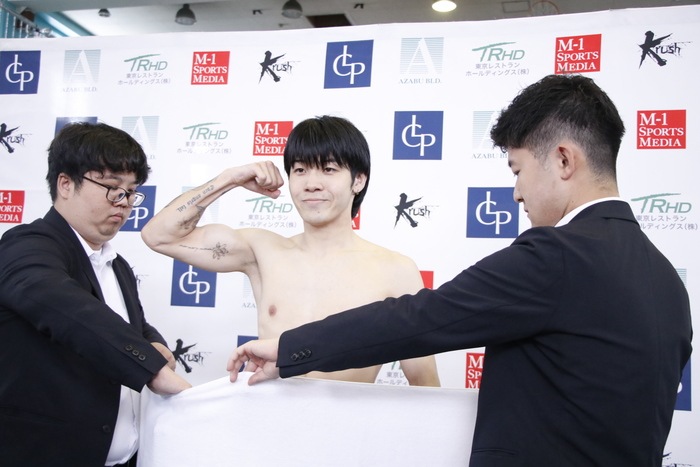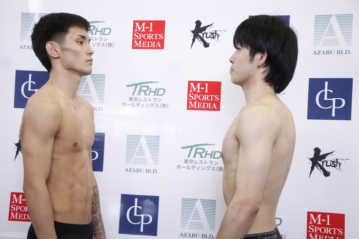 第6試合のKrushバンタム級3分3R延長1Rで対戦する、白幡裕星(K-1ジム総本部チームペガサス)は53.0kg、長野翔(K-1ジム三軒茶屋シルバーウルフ)も53.0kgと両者ジャストで計量をパス。