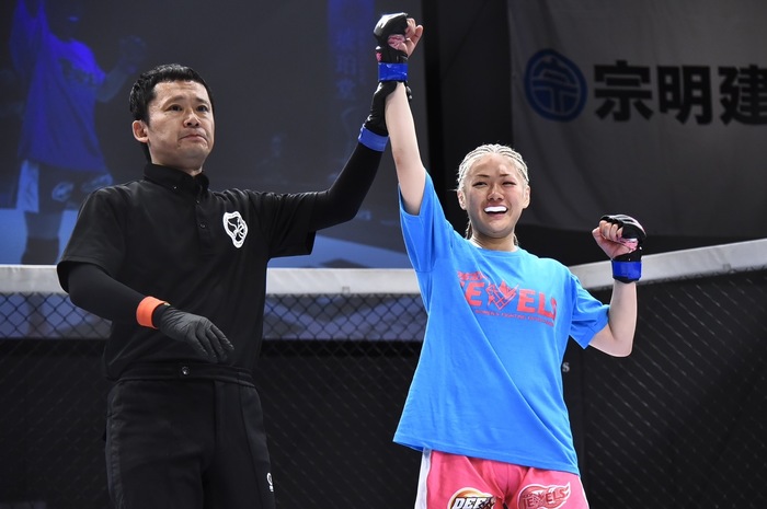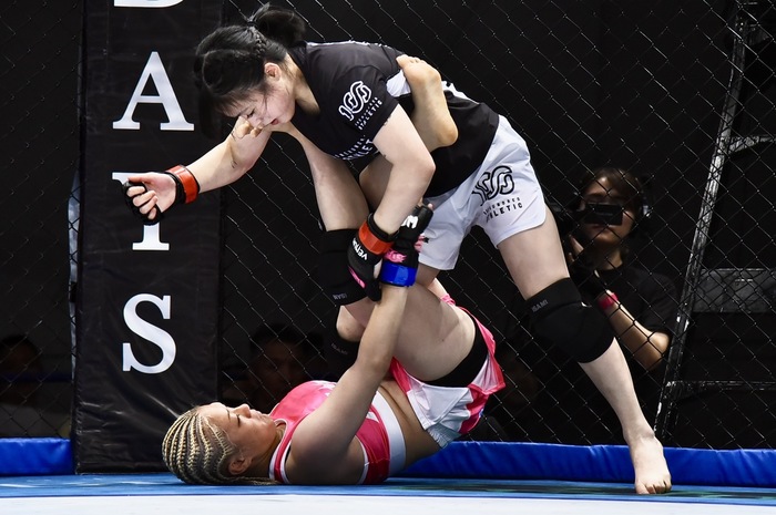 すぐにバッククリンチの大井はボディロックテイクダウン。マウントでパウンド! しかし、そこに下からシザーズを合わせる渡辺は、三角絞め! さらに腕十字に大井を寝かせてゴング。渡辺のラウンドに。