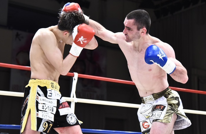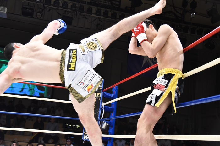 1R、前へ出て左右のローを蹴るトファネリに塚本はワンツーとヒザ。アグレッシブに左ローを中心に蹴るトファネリ、塚本も右カーフで応戦。右ミドルを連打する塚本だが、トファネリが強烈な右フック。身体が泳ぐ塚本にトファネリはパンチで襲い掛かり左ロー、バックハンドブロー。塚本はヒザを蹴るがトファネリにプッシュされてバランスを崩し、左ローで転倒。左ローのダメージが明らかに。