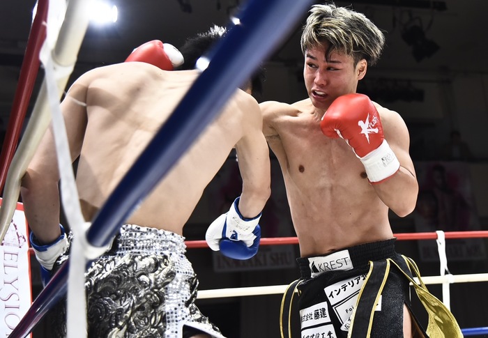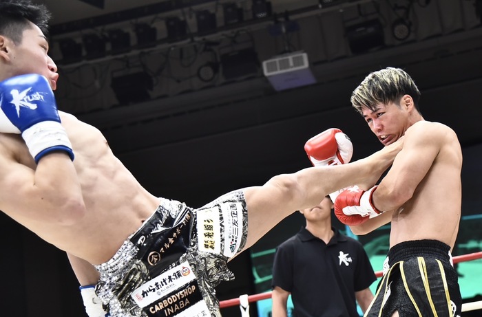 2R、前に出て右フックを振っていく鬼山に齊藤は前蹴り、隙あらばアゴにまで上がってくるヒザ。そのヒザを太もも、腹にも突き刺す。テンカオ、前蹴り、ジャブで、顔面前蹴りで先手をとる齊藤。しかし、前蹴りを出して踏み込み右ストレートを打ったところに不用意に左フックをもらい、ダウンを喫する。