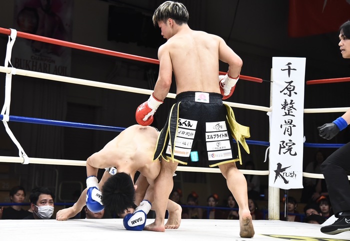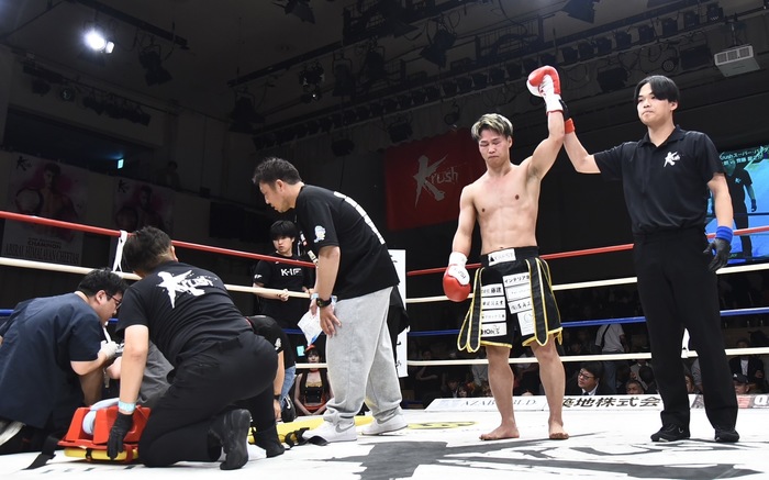 このチャンスに鬼山は前へ出て、ジャブで齊藤にロープを背負わせると右を打ち抜き、齊藤は前へバッタリと倒れて失神。鬼山が豪快なKO勝利を収めた。齊藤はしばらくリングから降りられないほどのダメージを負った。
