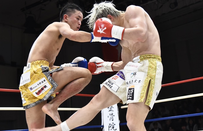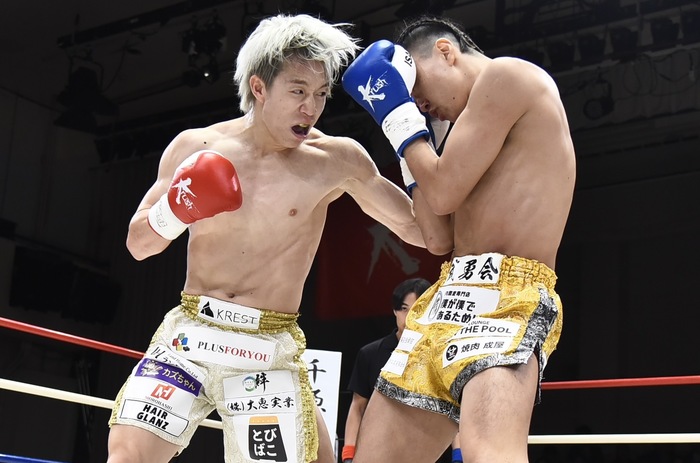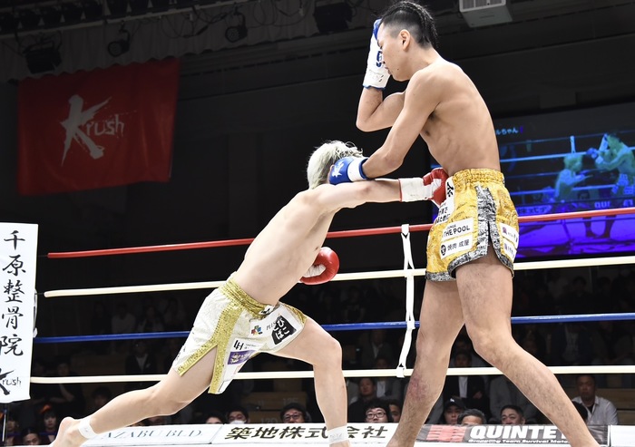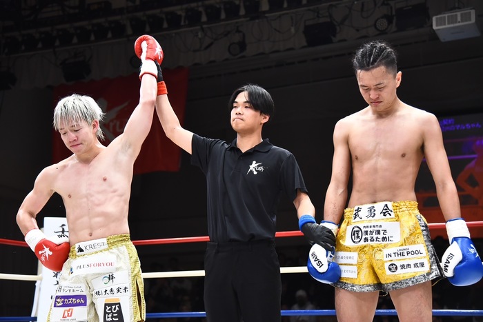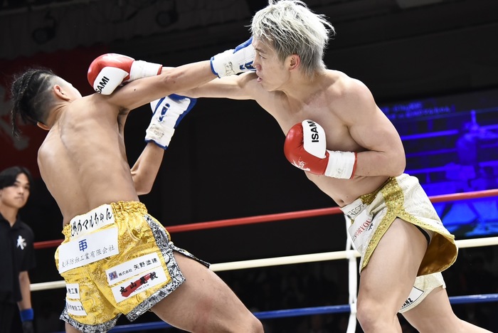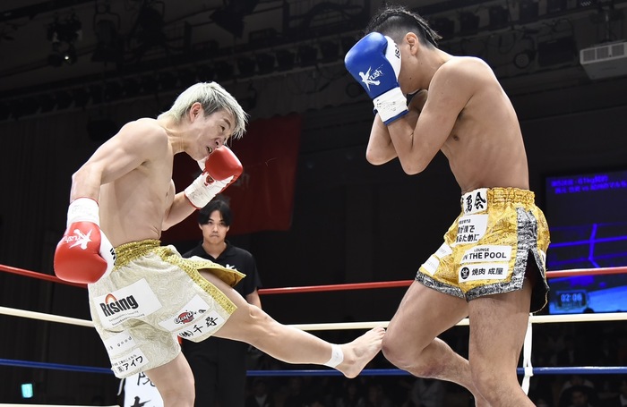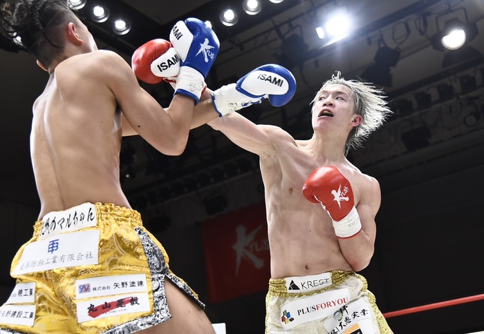 2R、西元は薙ぎ払うような右インカーフ、右三日月。西元は左ボディと左フックで畳みかけるが、マルちゃんは左ミドル、左インローで反撃。飛び込みの右ストレートを当てるのは西元。強打を当てる西元だがマルちゃんはポーカーフェイスで耐える。