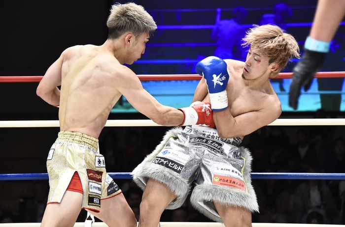 2R、銀次はジャブを打ちながら前へ出て打ち合いを挑む。超接近戦から右フック、右ボディ。銀次が右フック、左フックを単発ながら当てていく。寺島は右カーフ、左三日月。入り込んでボディを打つ銀次だが、右カーフを蹴られる。前へ出る銀次が右ストレート、右フックをヒットさせバランスを崩す寺島。