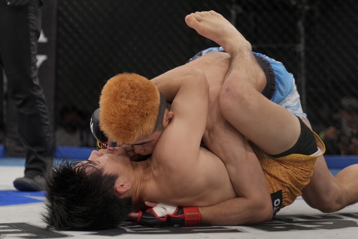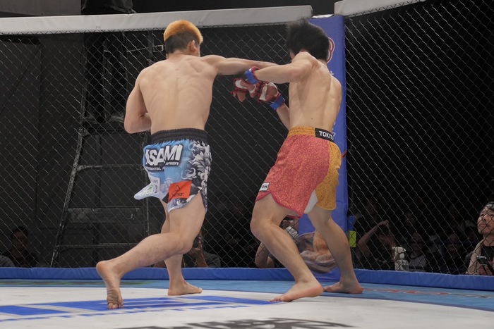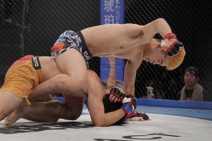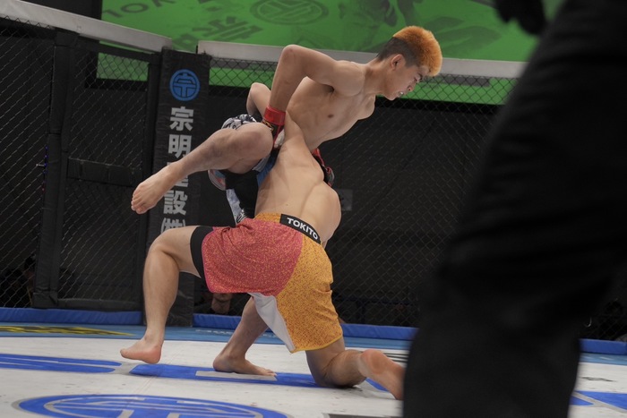 1R、ともにオーソドックス構え。久保優太の弟子の石坂が先に圧力をかけて左ハイ。時任も右ハイ。石坂の右ハイの打ち終わりに組んだ時任がテイクダウンもすぐに立つ石坂が右オーバーハンド。ともに左ハイ。石坂の右にダウンした時任はすぐにシングルレッグも立って組む時任がバック狙い。もぐりからスイープ狙いもトップの石坂。
