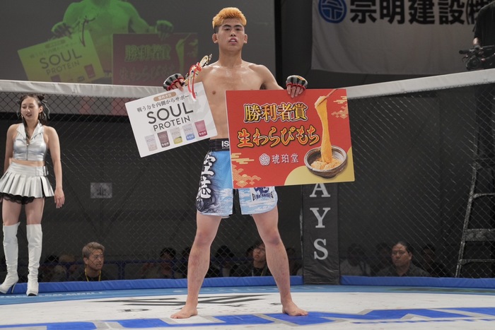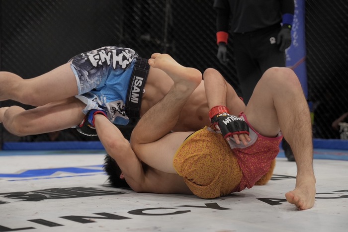 下の時任はマウントの石坂のパウンドからの腕十字にトップに! 腹固めの時任を落として再び石坂が上に。ハーフから押さえ込みゴング。