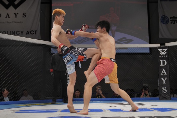 右ストレート、時任の入りに右ヒザを突く石坂。さらに右前蹴りから前に。右ストレートで前に出てゴング。