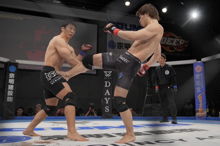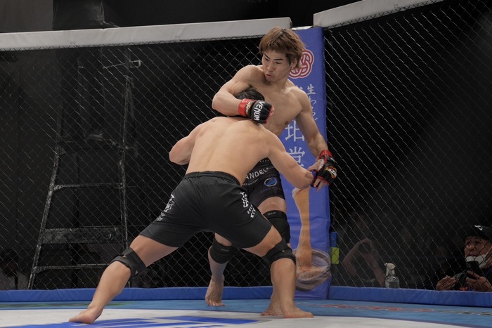 2R、左で差して組む三好を剥がしてオーソから右前蹴りを腹に突く中尾。三好はなおもヒザ着きでダブルレッグ。押し込む三好に体を入れ替えた中尾がヒザ。三好が小手巻き投げも中尾が残してゴング。