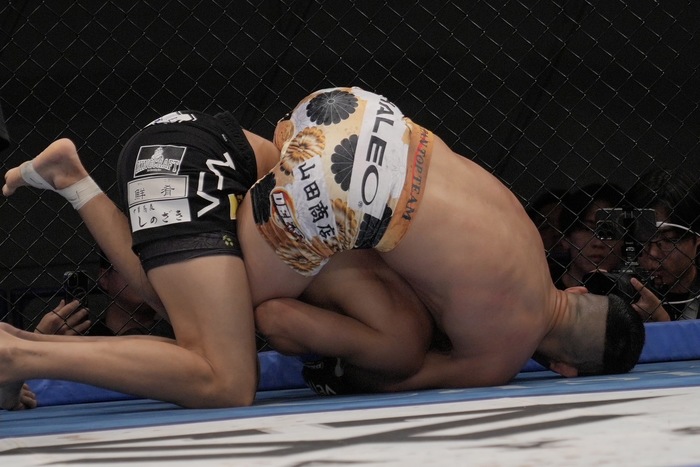 その際で押し込む宇良に山田はまたも足技でこかせてテイクダウン。バックに回りリアネイキドチョークをパームトゥパームで絞める。ボディトライアンングルでチョーク、フェイスクランクを狙うが、ゴング。