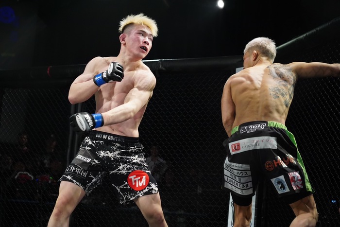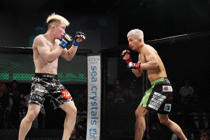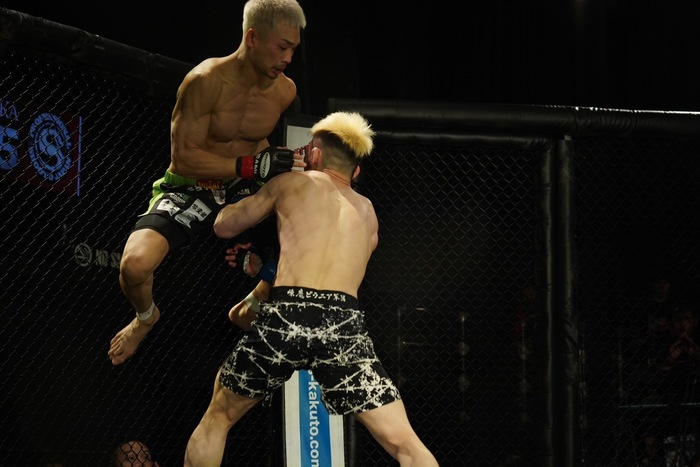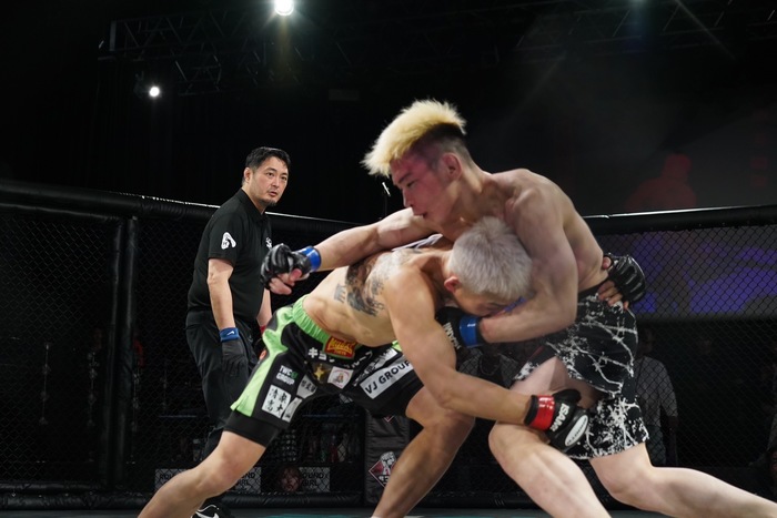 初回から消耗戦の動きのある展開。中央で左ジャブを突くダイキ。永井はなおも詰めて右ロー。右ボディ、左フックのコンビネーション。永井の右をかわして組んだダイキが押し込むと、永井がそのままテイクダウンを許してしまう。