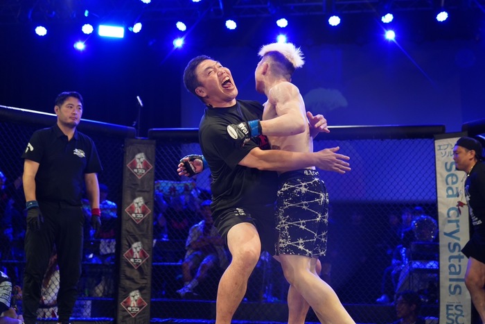 残り30秒、両足をさばいた永井がサイドに。ダイキは鉄槌連打を受けながらハーフにするも足は効いていない。永井は左を連打。亀になって立とうとするダイキを永井はサイドバックで腰を右手で抱えて、左を連打! 初回残り8秒でレフェリーが間に入った。ケージのなかで永井を大きく抱き上げた長南亮TRIBE代表。