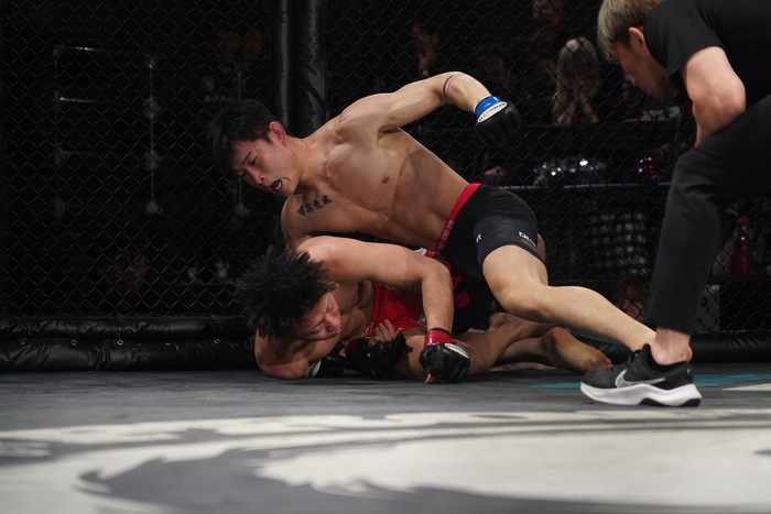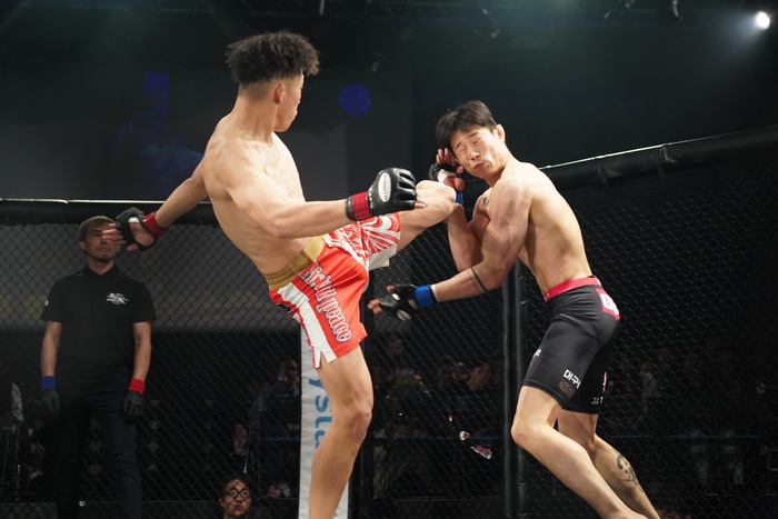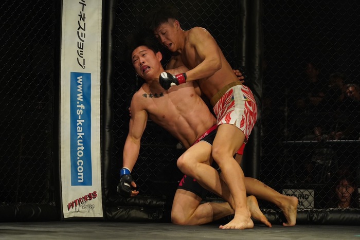 ケージに足をかけたことで亀になって立つ姿勢にない宇藤の身体が伸びたところで、サイドバック気味にパク・ジョンジュンは左の強いパウンドを脇下、上から打ち分け。アッパー気味にもらった宇藤の意識が飛び、レフェリーが間に入った。