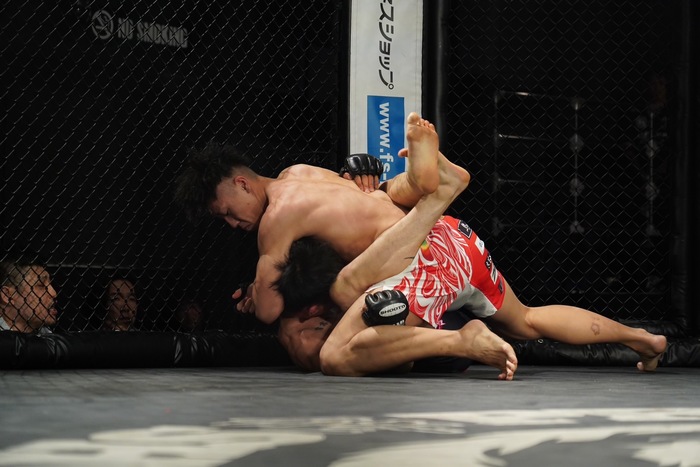 イージーに倒れた宇藤。下から左手を押し込み右足を首もとにnかけて三角絞めへ。しかし左足を組めず。ケージに押し込み、右のパウンドのパク・ジョンジュン。右で腰を抱いて右手首も掴むと、宇藤はまたもケージを蹴ってスイープを狙うが、戻されて下に。
