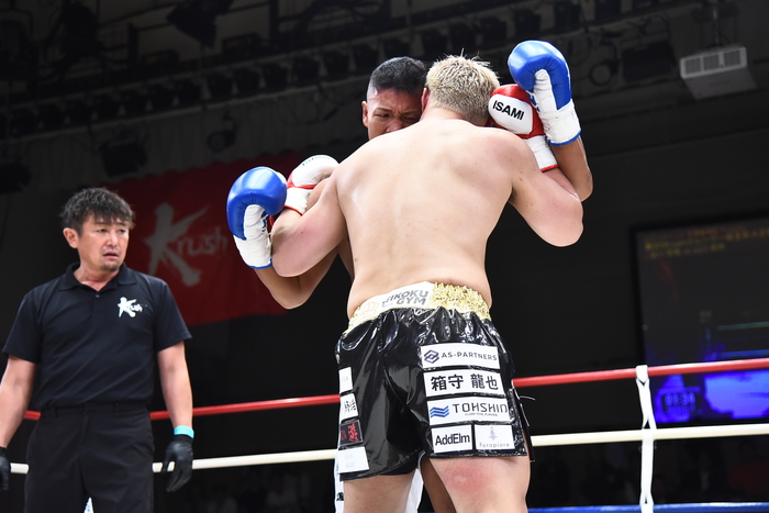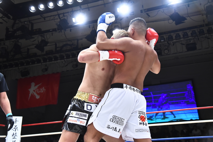 試合は、1Rに顔面ブロックを固めて前へ出る山口に、谷川は前へ出て右ボディ。山口の右ローにも右ボディをリターンして谷川が優勢。
