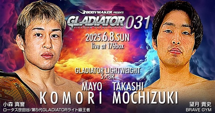 2025年6月8日(日)『GLADIATOR031』(大阪府豊中市176BOX)で、GLADIATORライト級王者・小森真誉(ロータス世田谷)と、望月貴史(BRAVE GYM)のノンタイトル戦の実施が発表された。これで本戦全18試合が決定した。