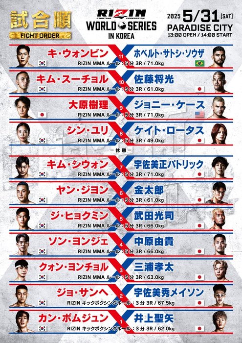 2025年5月31日(土)韓国仁川のパラダイスシティで開催される『RIZIN WORLD SERIES in KOREA』の試合順が、下記の通り決定した。チケットは全席完売。13時開場で14時から試合開始となる。
