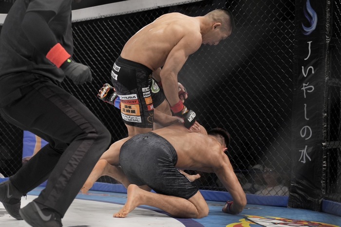 「あれはまあ、ちょっと萎えたんですけど(苦笑)、相手がすごい効いてるのがもう分かっていて、さらに反則のヒザ蹴りじゃないっていうのは、蹴ってる自分が一番よく分かっていた。でもセコンドから『いや、お前が考えることじゃない。審判が判断することで、お前はもうゲームに集中しろ』って石渡(伸太郎)さんに言われて。散々2人で時間共有して、石橋さんとは練習やってきてるんで。“ボスがそう言うなら確かにな”っていう風にもう切り替えましたね。相手は効いているのは効いてるじゃないですか。スタンドから再開しようが、ダメージはゼロにならないんで、その言葉で全然ネガティブにならなかった。オッケーって感じでした。集中力は切れなかったです」