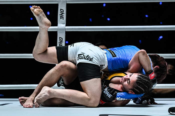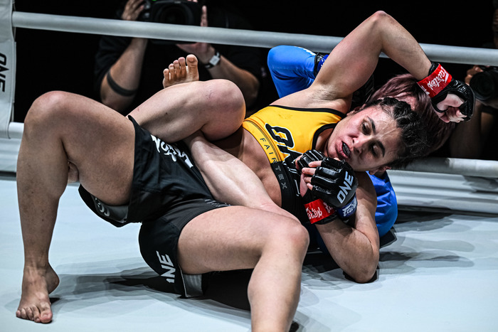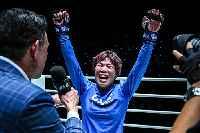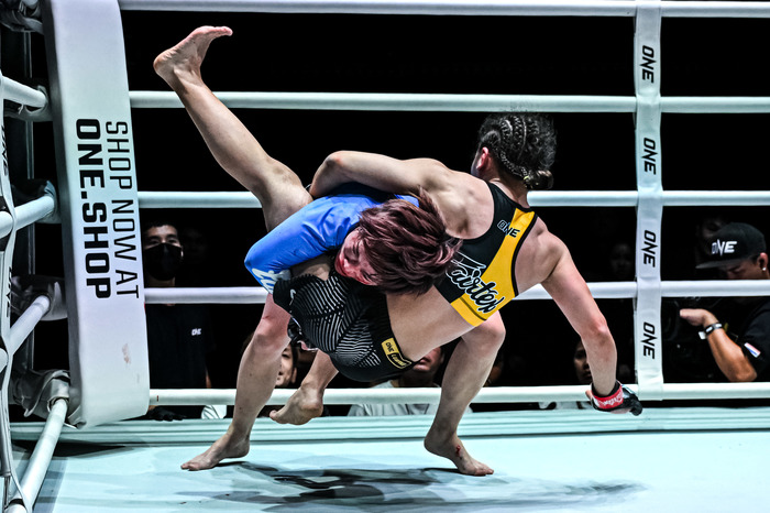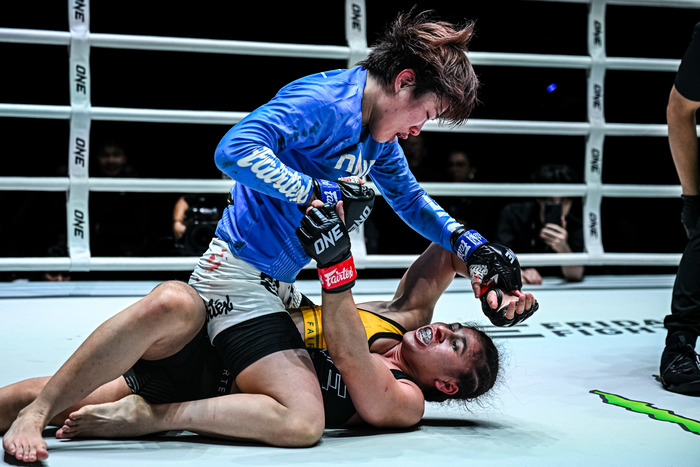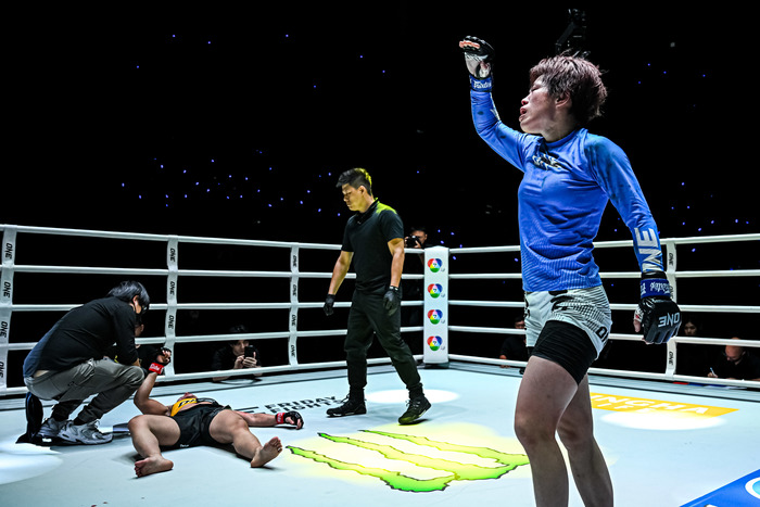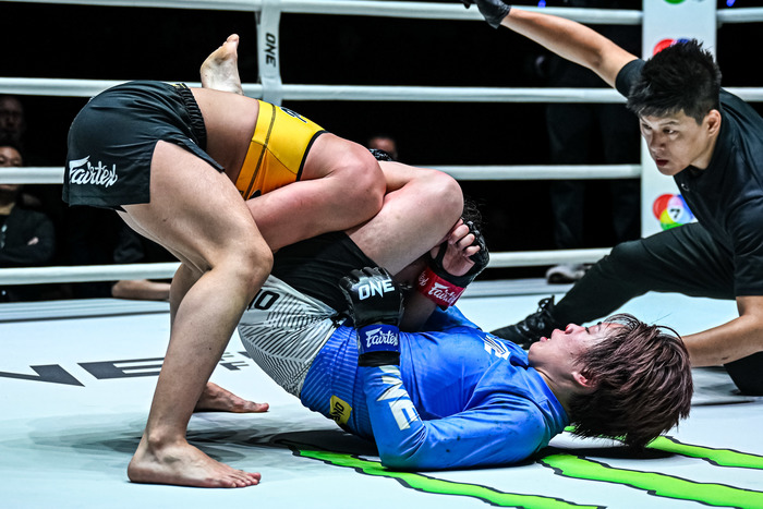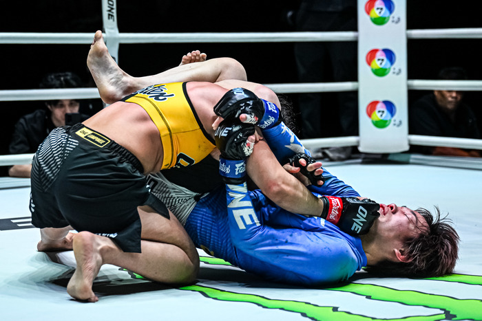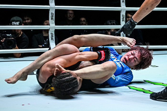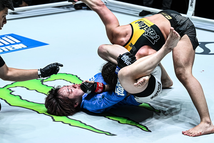 4戦無敗アリエワの打撃を被弾も、柳がレッスルアップでテイクダウン、三角絞め極める=ONE