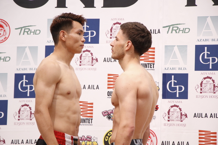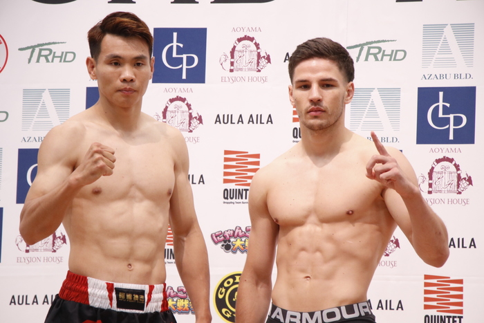 第15試合のK-1 WORLD GPスーパー・ウェルター級(-70kg)タイトルマッチ3分3R延長1Rで対戦する、王者オウヤン・フェン(中国/天津阿福ファイトクラブ/CFP/)=69.3kg、挑戦者ダリル・フェルドンク(オランダ/Fight Team Ringer)は69.8kgでそれぞれ計量をパス。