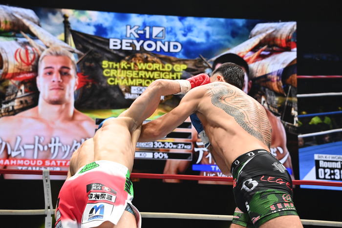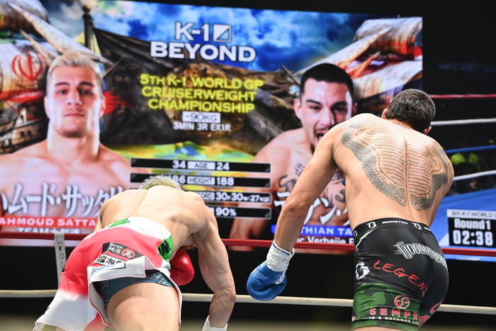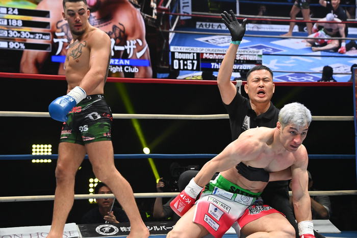 1R、ターザンはよく伸びるジャブ、サッタリも重いジャブ。ターザンの左ミドルにサッタリが右フックを合わせてダウンを奪う。襲い掛かるサッタリが左右フック、右ストレート。しかし、ここでターザンがサウスポーでの右フックからの左ストレートを打ち抜いてダウンを奪い返す。