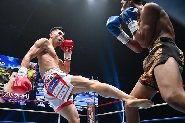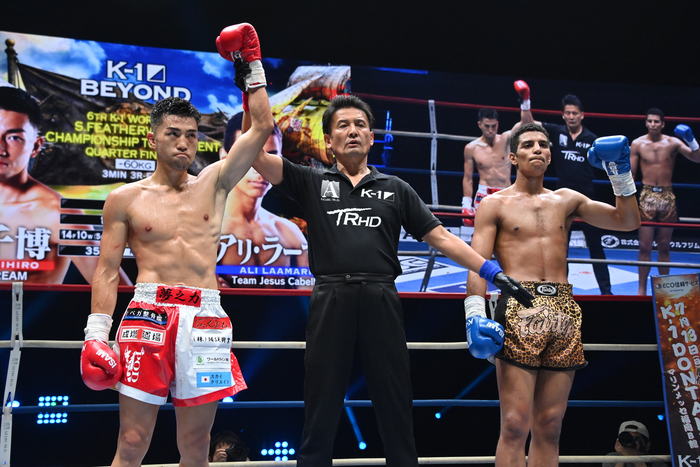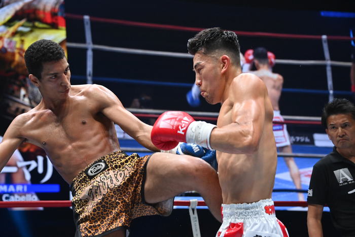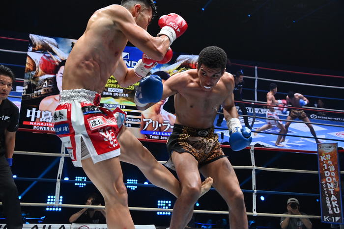 1R、サウスポーのラーマリは左ミドルから左ストレート、中島は右ボディストレート。中島は蹴りを放って行くが距離が遠く、ラーマリにかわされる。ワンツー、左ミドルで攻めるラーマリだが、中島がアッパーを打ってきたところにヒザを合わせるとそれがローブローに。中島にはインターバルが与えられる。左ミドル連打で前に出るラーマリ。