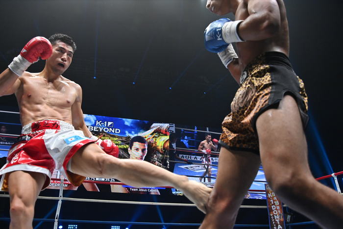 2R、サウスポーの中島が前蹴りを出しながら前へ出る。右の三日月も命中し、距離が合ってきたようだ。蹴りからパンチにつなぐラーマリが左ミドル、左フック。両者とも空振りが目立つ。中島は額の右側をカットして流血。