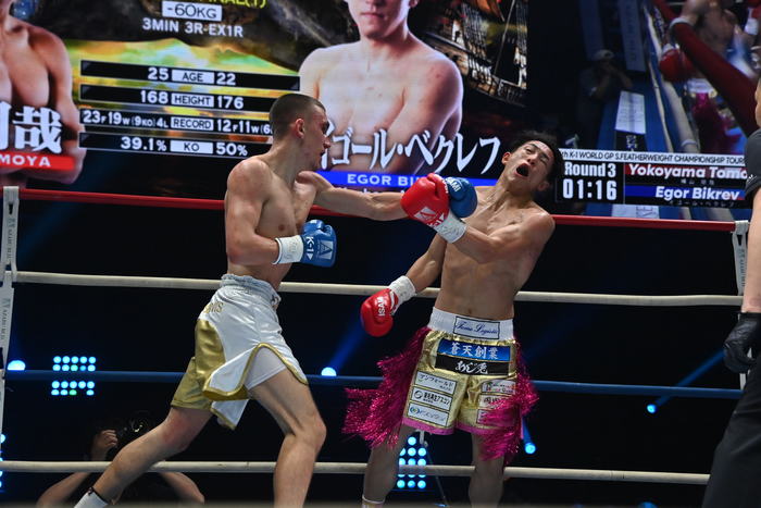 3R、横山は左ボディストレートを伸ばし、前に出るベクレフを前蹴りで押さえる。ベクレフは右ストレートから後ろ蹴り、横山は左右フックで応戦。パンチで追っていくベクレフが左フックから前蹴り、左のショートでダウンを奪い返す。