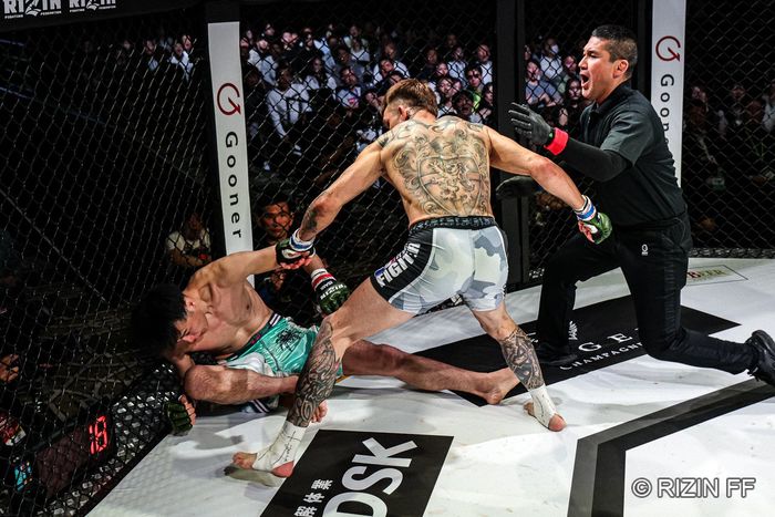 ケージに詰まると、ケースは大原の右から左をかわして右のスイング! 大原が糸が切れたように倒れ、すぐにレフェリーが間に入った。