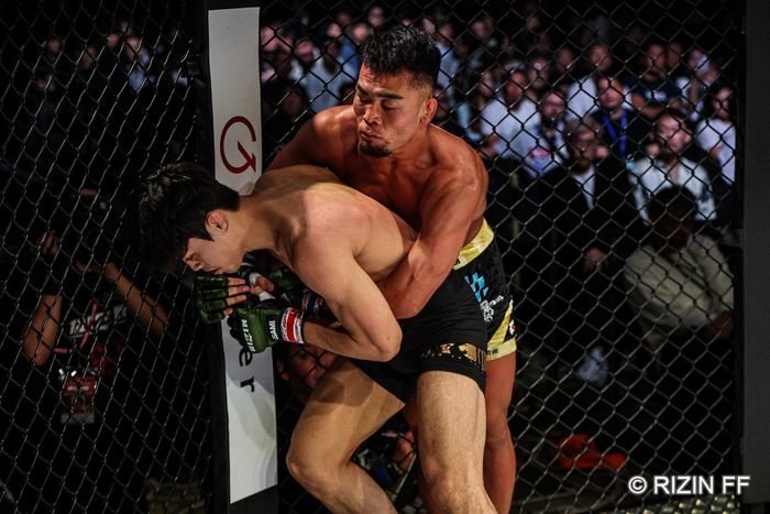 シングルレッグに入る武田を切って、その入りに右を突くジ・ヒョクミン。なおも詰める武田はシングルレッグから右差しで押し込み。ハイクロッチで崩すが、片足立ちで着地するジ・ヒョクミン。上組みに切り替える武田は崩しも、残すジ・ヒョクミン。武田は眉間から出血。