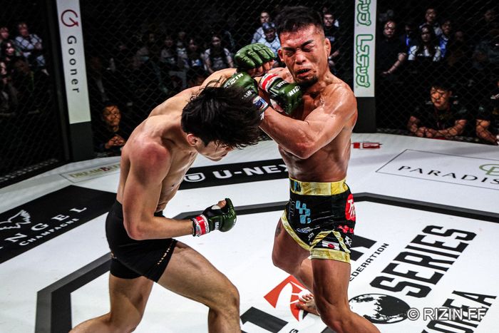 1R、ともにサウスポー構え。ジ・ヒョクミンは左ロー。武田はシングルレッグからクラッチして持ち上げてテイクダウン、パウンド。立つジ・ヒョクミンをバックに投げる。再び立ち上がると武田はバッククリンチ。正対したジ・ヒョクミンに右で差して左のパンチ。顔を剥がそうとするジ・ヒョクミンは左ヒザ。押し込む武田は右差し。ヒジを押し付けるジ・ヒョクミン。ゴング。