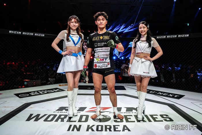 19歳のジ・ヒョクミンは「BLACK COMBATのジ・ヒョクミンです。生涯最高の勝利です。勝って三浦孝太と試合を、と言いたかったのですが、三浦選手が負けたので言い辛くなりました。日本の最高のイケメン、韓国最高のイケメンのこのジ・ヒョクミンと対戦するのはいかがでしょうか」と語り、ケージサイドの彼女を紹介した。