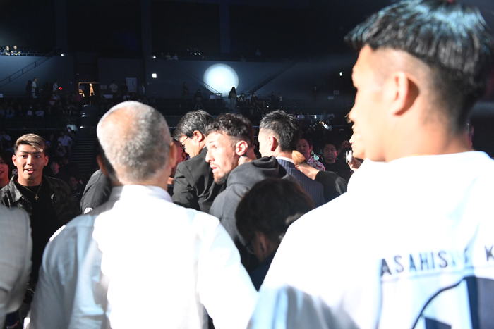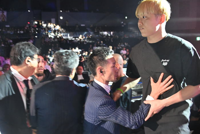 多くの怒声が響き、大勢の人が立ち上がって揉めている様子。観客同士のトラブルかと思いきや、そこにいたのは井原良太郎、よーでぃー、村田将一といったBreakingDownのメンバー。朝久兄弟、レオナ・ペタス、児玉兼慎、木村“フィリップ”ミノルらの姿もあった。