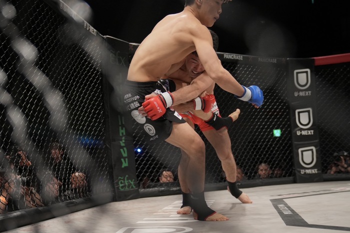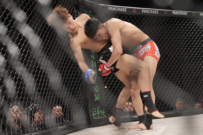 2Rもシングルレッグテイクダウンの田嶋だが、ケージ際ですぐに立つ山木。田嶋は右ロー。詰める山木の右に、田嶋はダブルレッグテイクダウン!
