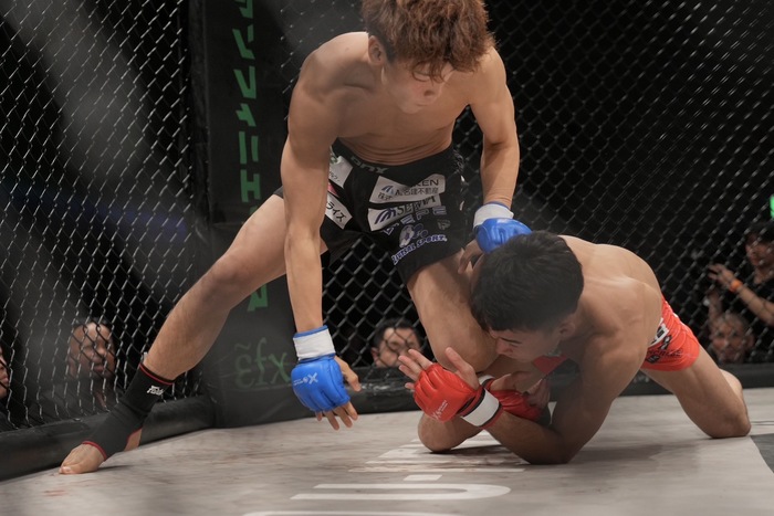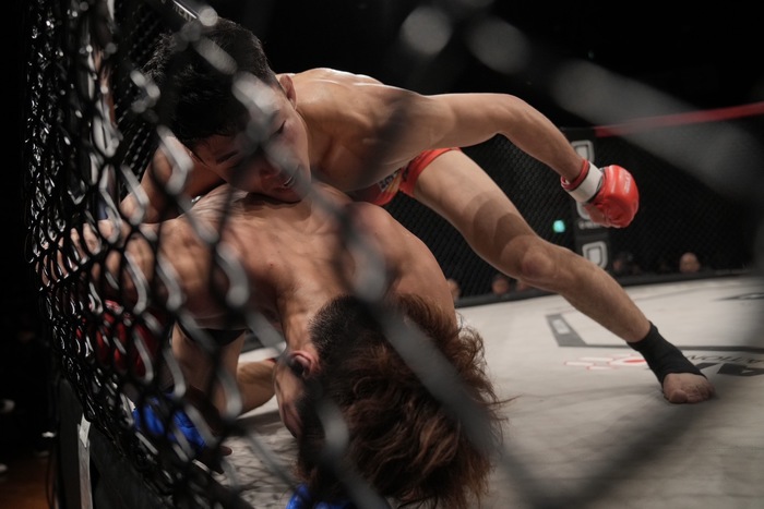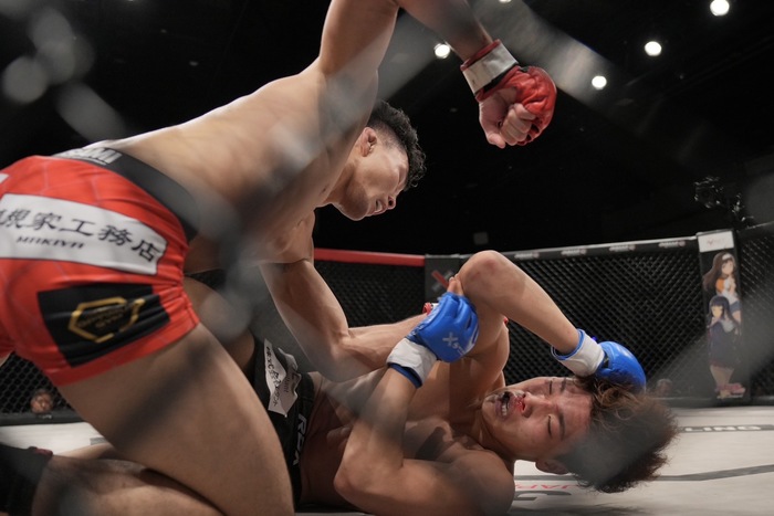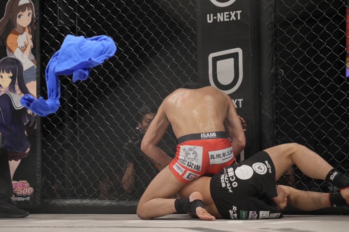 3R、山木のワンツーを潜り、ダブルレッグからやぐら投げの田嶋に、山木も切りかけるが、田嶋はなおも押し込み潰して上に。ケージ際で立とうとする山木をボディロックテイクダウン! マウントを奪いパウンド、青コーナーからタオルが投入された。