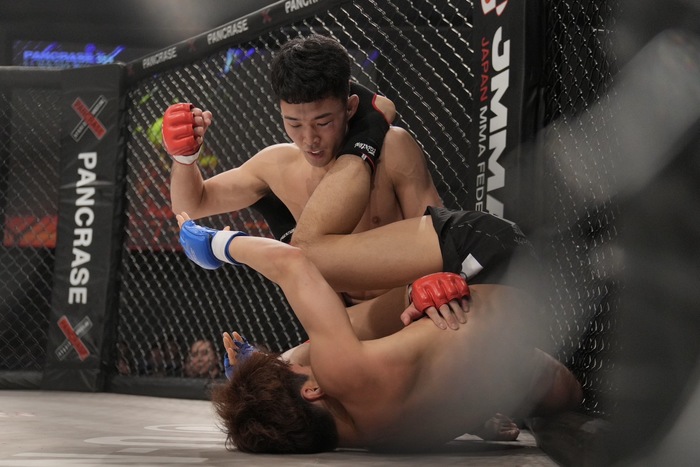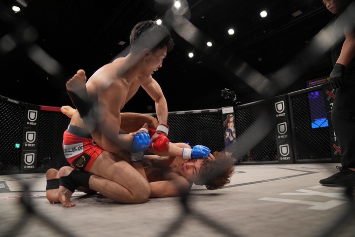 1R、田嶋はシングルレッグへ。片足立ち山木をテイクダウン。立ち上がりにパウンドをまとめ、右で腰を抱き、小外がけテイクダウン。立ち山木を再三こかしてトップに。背中をついた山木の腕十字狙いをかわして鉄槌。