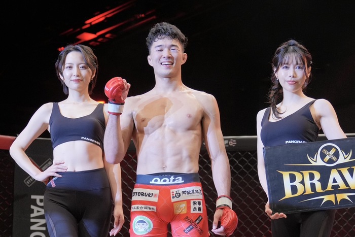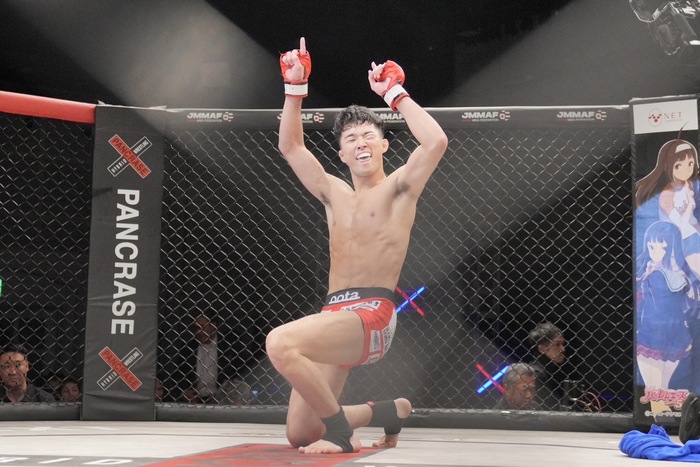TKO勝ちした田嶋は左目下を少し腫らしながらも、マイクで「いい勝ち方したんで、次はタイトルマッチをお願いします」と語った。