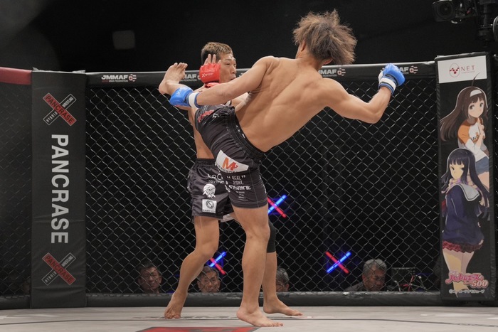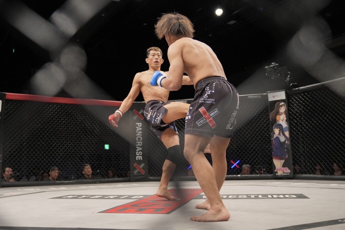 1R、サウスポー構えの中村に、オーソの岡田は脱力して遠間から右の蹴り。中村は右ロー。岡田は右を突いて組み。組んで崩し狙うも中村が残すと岡田は左で差して押し込み、ヒザを突いて離れる。