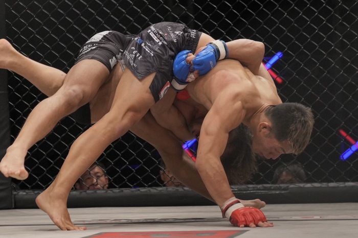 左ミドル、右ローの蹴りで前に出る中村。左を突き、左ハイをかすめて前に。ボディロックから小外がけテイクダウンへ。しかしここは岡田が左小手巻きで残してケージ際に。左小手で内股で2度投げる岡田にすかして残す中村が岡田の投げをすかして上に! ハーフガードの岡田に背中を着かせて肩パンチ。ジャッジ1者が中村が支持も、2者が岡田を支持。