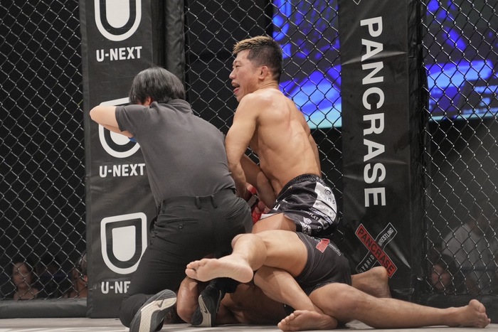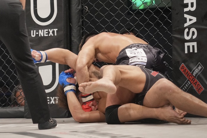 3R、岡田の右に右ローを蹴る中村。右を突く岡田に、中村も左ミドル。左前手フックを突く岡田に、組んだ中村は右で差して押し込み。体を入れ替える岡田がヒザ。中村の投げを残して右で差して投げた岡田が上に! そのままトップからマウント。右の鉄槌連打から左右を落とすと、レフェリーが間に入った。