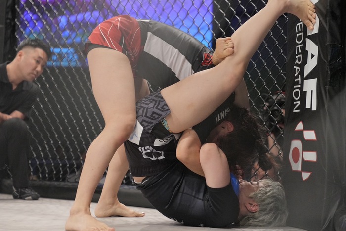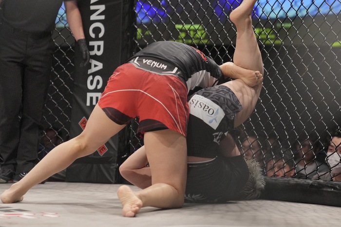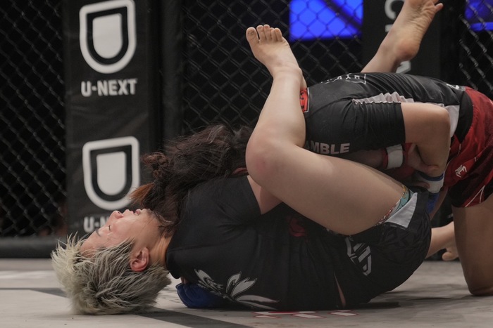 1R、右を突いて組んだ和田が四つから小外がけテイクダウン。しバックマウントに胸を合わせてトップのオノダマンはパウンド。そこに和田は下から三角絞め。